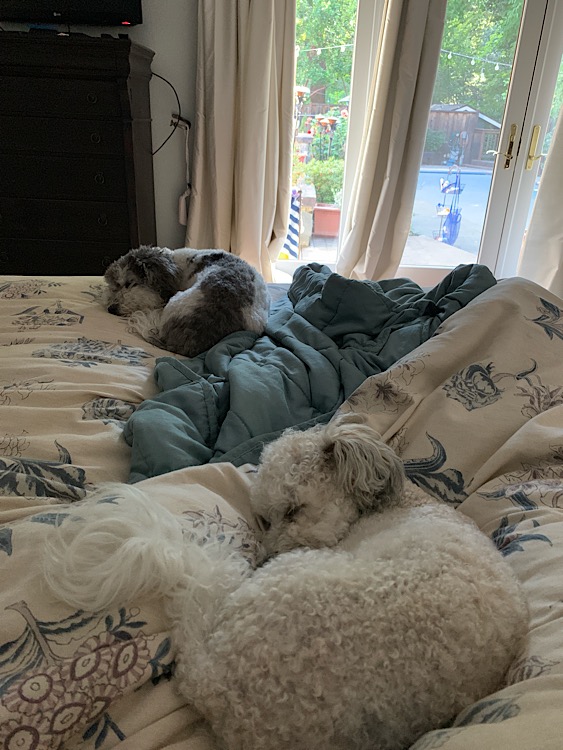 I’m at home now, in my parents’ backyard, with it’s ineffectual citronella candles, the deer rustling in the creek beyond the deck, the puppies cuddled to my side, craft IPA beers on endless tap, my hair falling around me without the mess and tangles of humidity, in a shirt that says “sorry for partying,” which my mom rolls her eyes at and pretends to hate but that’s why I wear it.