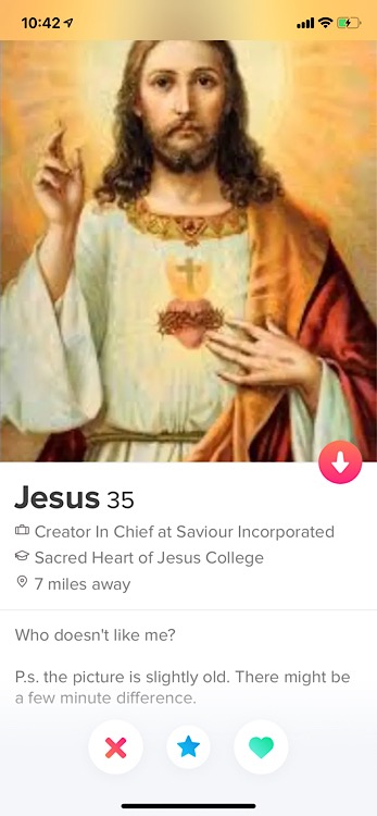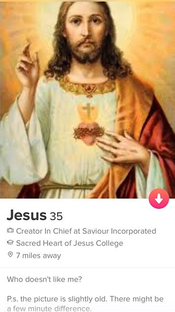 Quote of the Week: As you might know, I spend a lot of time scrolling Tinder to feel better about myself to feel worse about my life and the very shallow nearly dried up pool of eligible men there seem to be out there for comedic material to try and find some dates, and occasionally I come across a profile that begs for public recognition. This wasn’t the first time I’d seen Jesus on Tinder, but this was a different profile. I posted a screenshot of it on my instagram, and my funny friend Ben left a fantastic comment. Made my whole day.