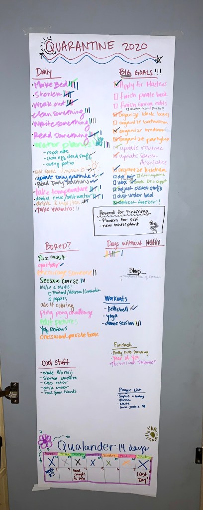Like any intelligent person with self-awareness, I put some REAL simple things on there. You gotta start with things you know you can do! Something you probably already did before you wrote the list of goals! For me, it was “Shower” which this California girl who grew up in droughts still never takes for granted, and “make bed” because that is just straightening out the duvet. I don’t even have a sheet. BUT I get to check something off when I do it! Success! I was tempted to write “put on a bra” but I’m actually ready to start our next revolution about those. They just be optional in Covid times.
